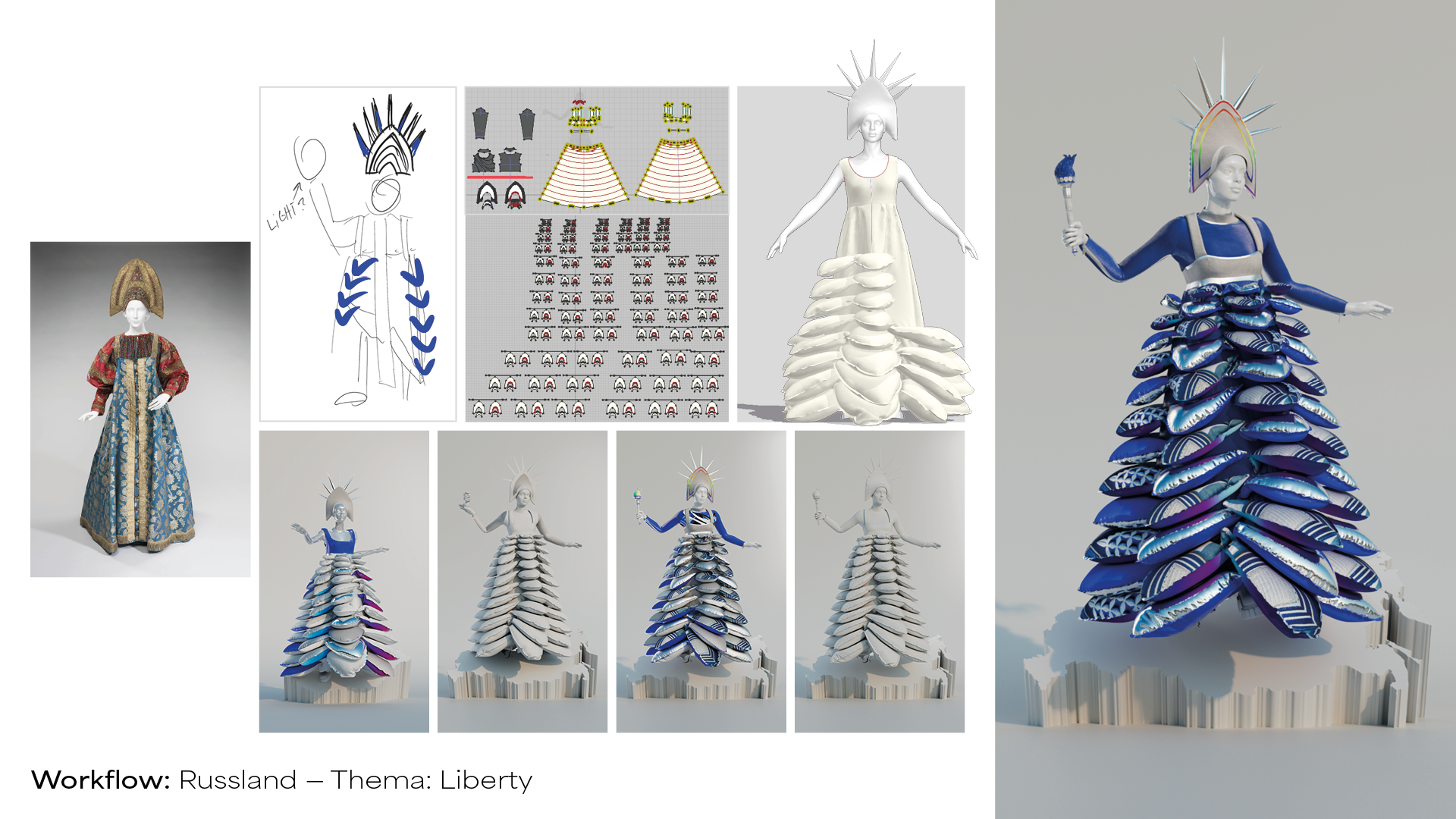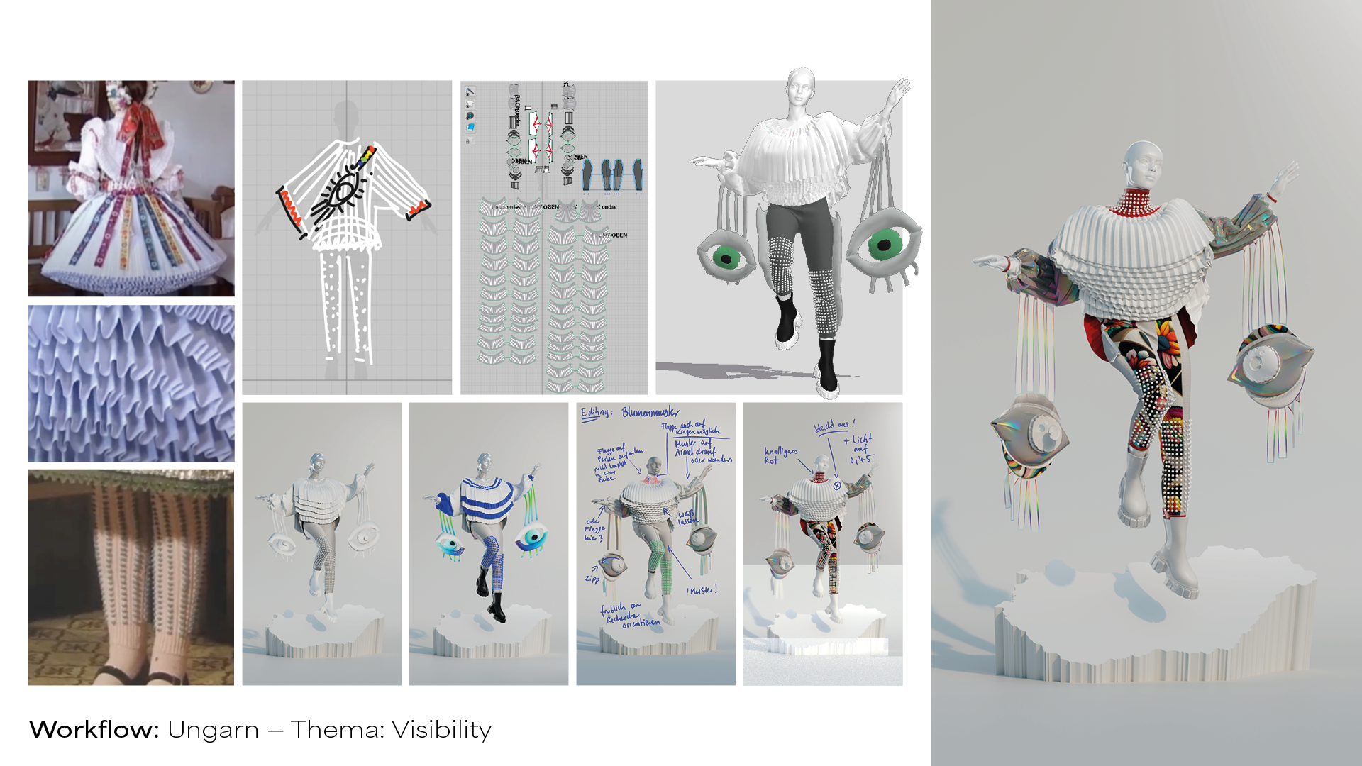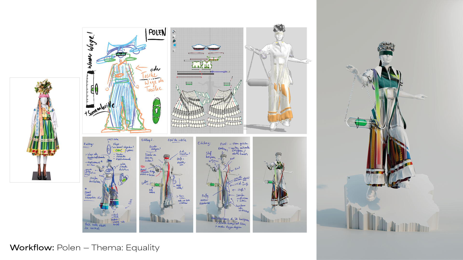 My Bachelors Thesis/Project is a three-piece Digital Fashion Collection, reinterpreting traditional costumes of countries with queerphobic laws. Traditional costumes represent national identity. Countries like Hungary, Poland or Russia often discriminate against and exclude queer people from being part of their society. My aim was to reinterpret those traditional costumes so that they include and reflect queer identities and people as part of the country. On top of that I combined the outfits with a specific social issue/topic that is important for the queer community, like Visibility, Equality and Liberty. To create patterns that look organically and not repetitive I used midjourney AI. This allowed me to create abstract patterns that are inspired by national colors and embroidery without copying them. Each Outfit can be worn through an Augmented Really Snapchat Filter. If you want to try them out yourself just search for »Hungary Queer« — »Poland Queer« or »Russia Queer« in the Snapchat Filter Library.